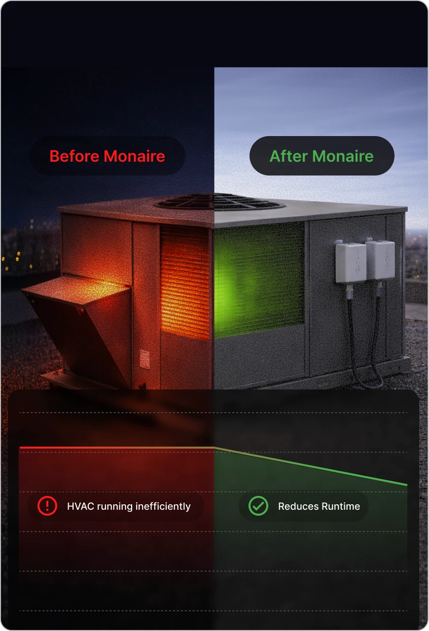 Monaire continuously adjusts your HVAC systems in real time to eliminate energy waste. No schedules to manage. No rules to configure.