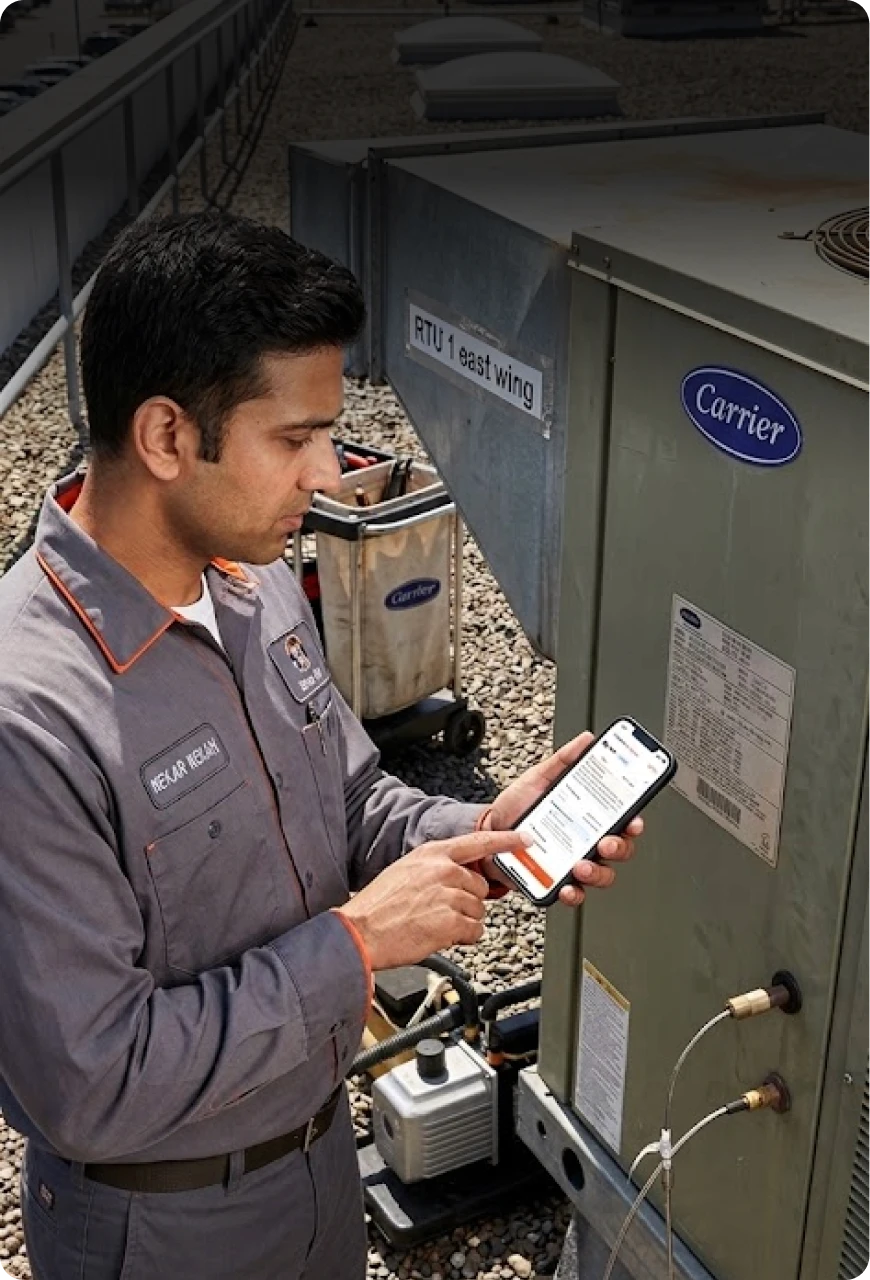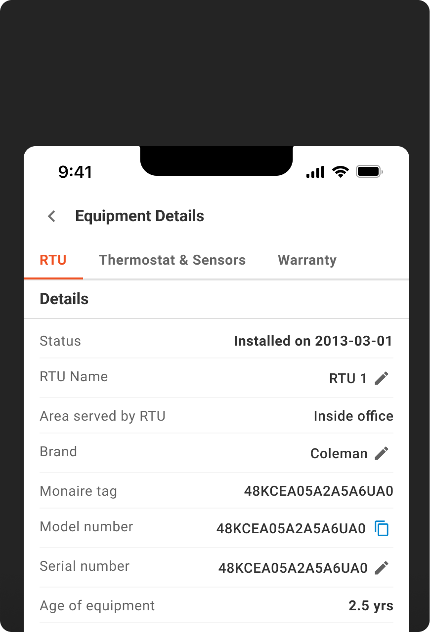 Monaire captures model, serial number, nameplate data, and performance characteristics for every asset.